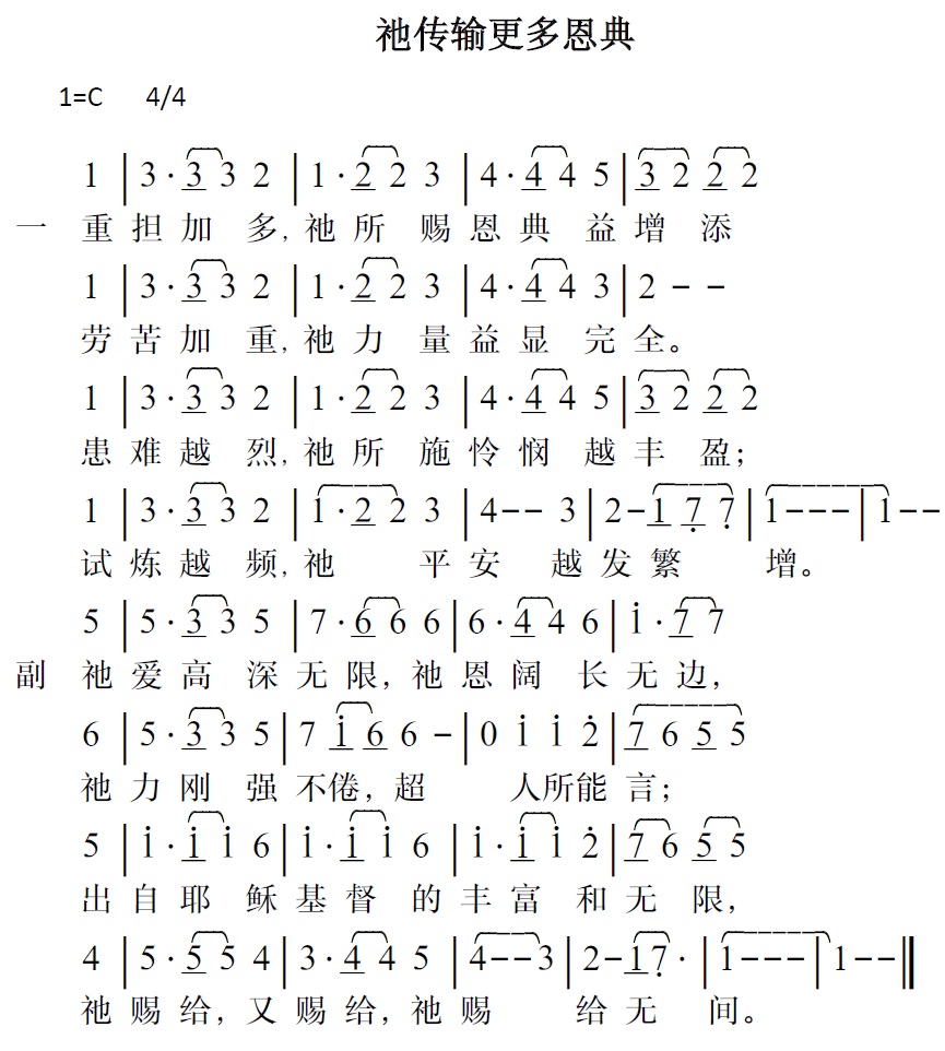 祂爱高深无限,祂恩阔长无边,祂力刚强不倦,超人所能言;出自耶稣基督的丰富和无限,祂赐给,又赐给,祂赐给无间。