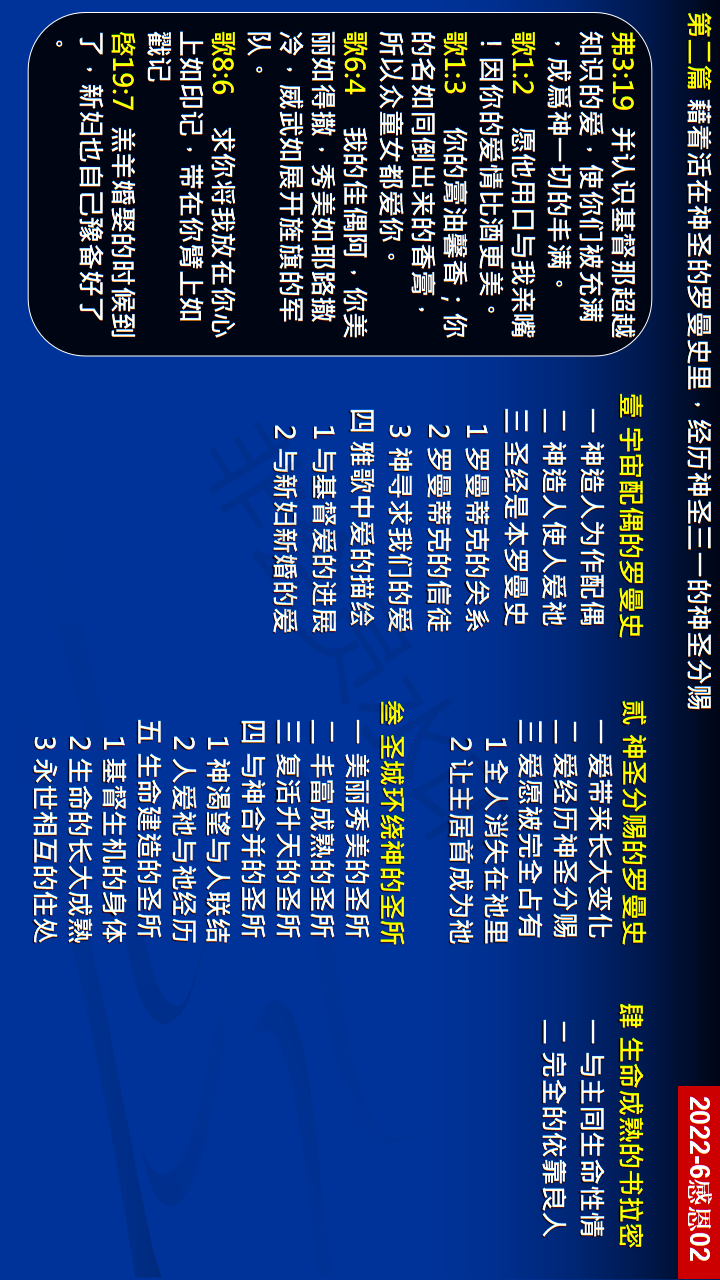 叁 属天圣所的表征:①作神居所的美丽②在升天里过生活③在至圣所过生活④用上好的爱爱主⑤与身体建造有关