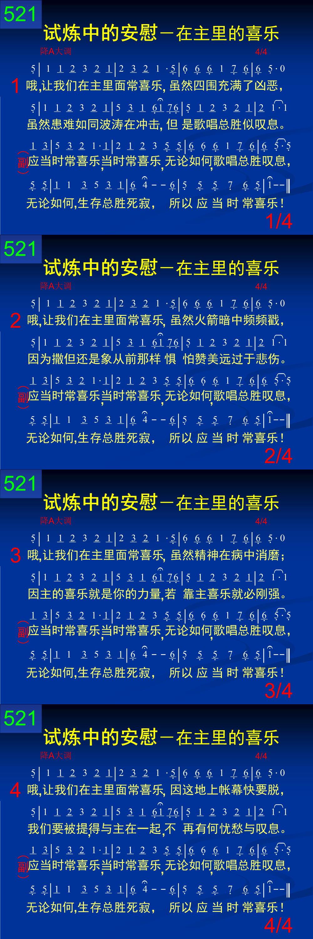 哦,让我们在主里面常喜乐,虽然精神在病中消磨;因主的喜乐就是你的力量,若靠主喜乐就必刚强。