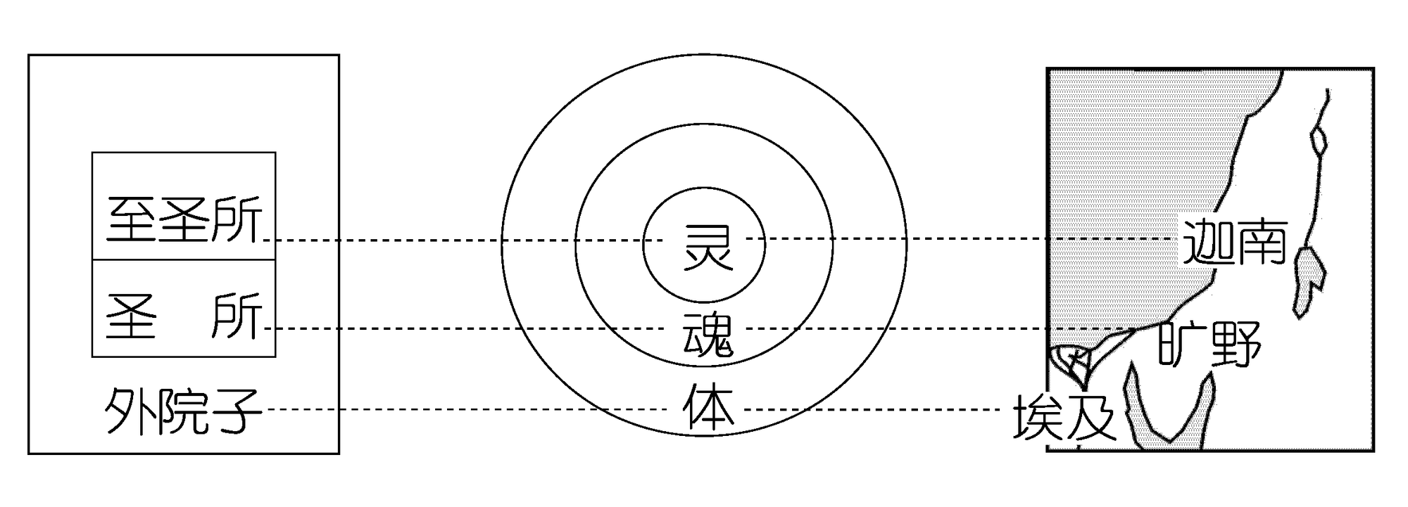在本篇信息的开头,我们要先读《神的经营》一书第三章的部分内容。这本书所收录的信息,是李弟兄在美国开工早期释放的。其中有一幅对照图如下。我们看见这张图的左边有至圣所、圣所和外院子;中间有灵、魂、体;右边有迦南、旷野和埃及。