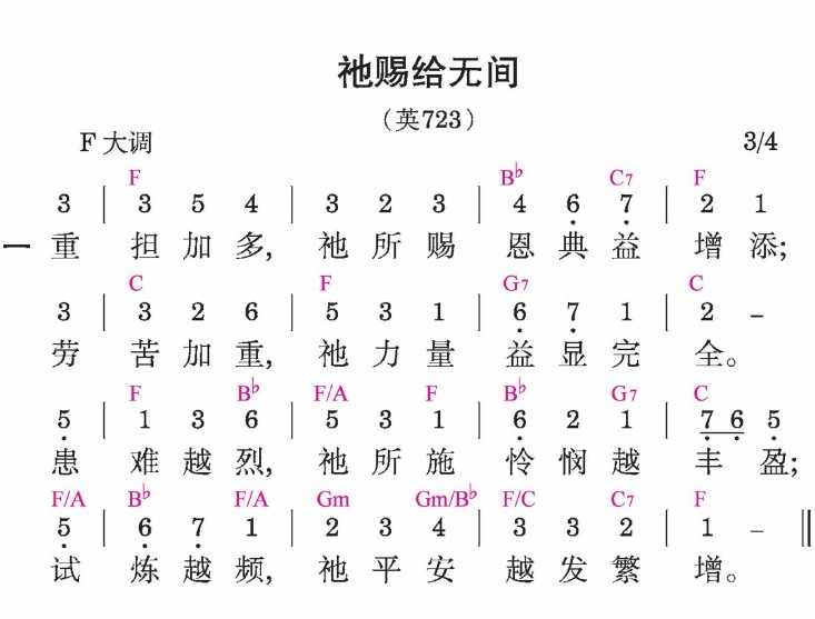 祂爱高深无限,祂恩阔长无边, 祂力刚强不倦,超人所能言; 出自耶稣基督的丰富和无限, 祂赐给,又赐给,祂赐给无间。