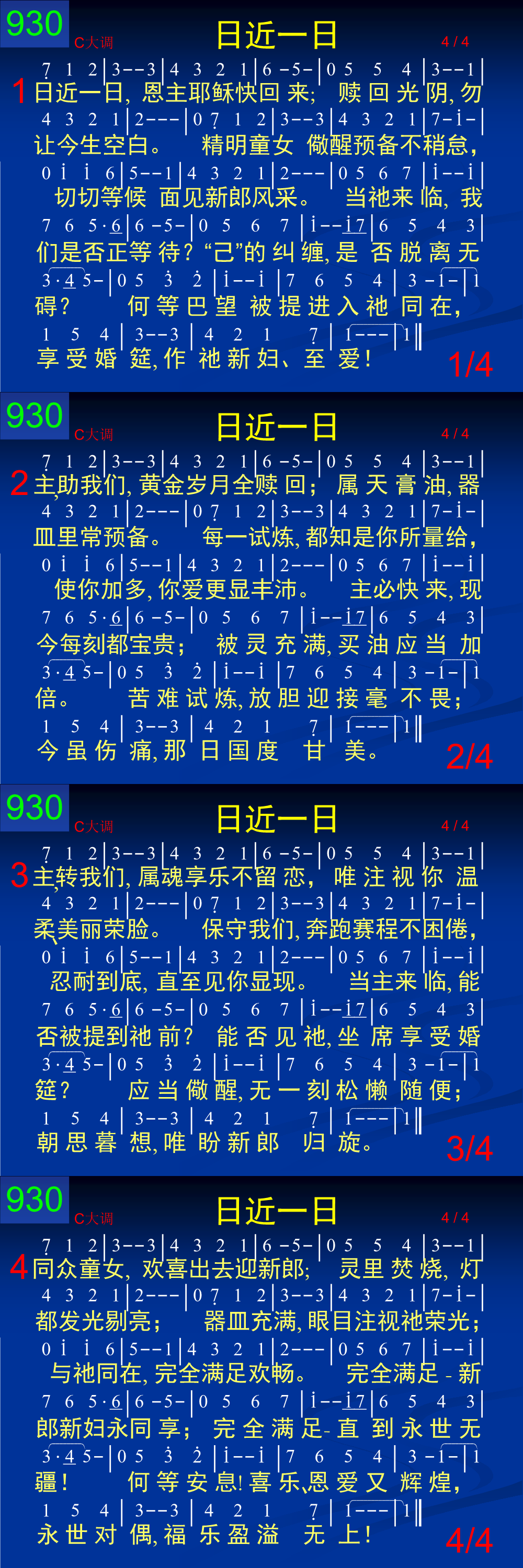 主,转我们,属魂享乐不留恋,唯注视你温柔、美丽荣脸。保守我们,奔跑赛程不困倦,忍耐到底,直至见你显现。当主来临,能否被提到祂前?能否见祂,坐席享受婚筵?应当儆醒,无一刻松懒随便;朝思暮想,唯盼新郎归旋。