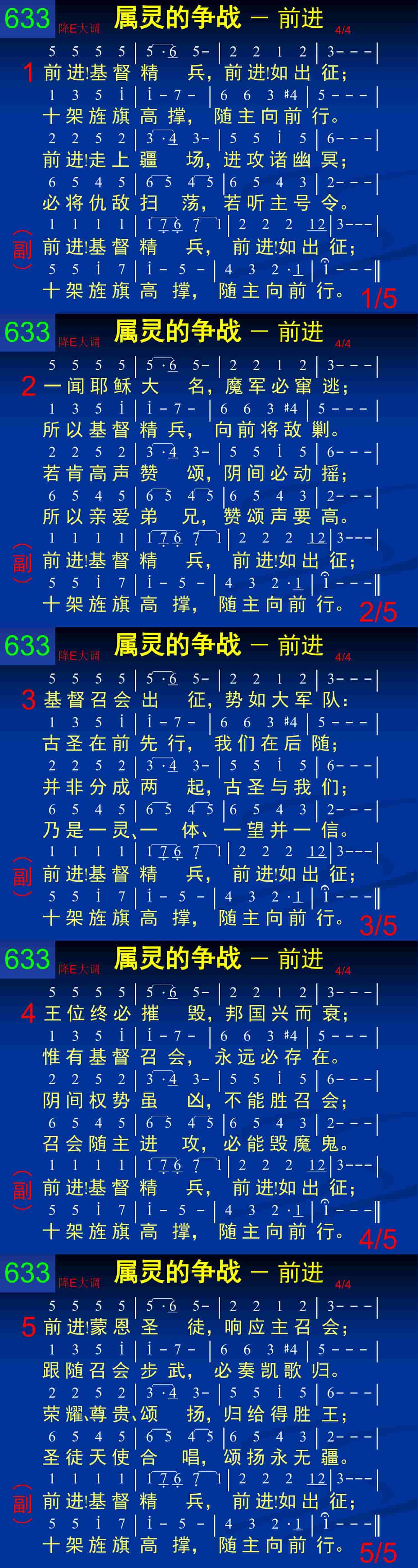 前进!基督精兵,前进!如出征;十架旌旗高撑,随主向前行。前进!走上疆场,进攻诸幽冥;必将仇敌扫荡,若听主号令。