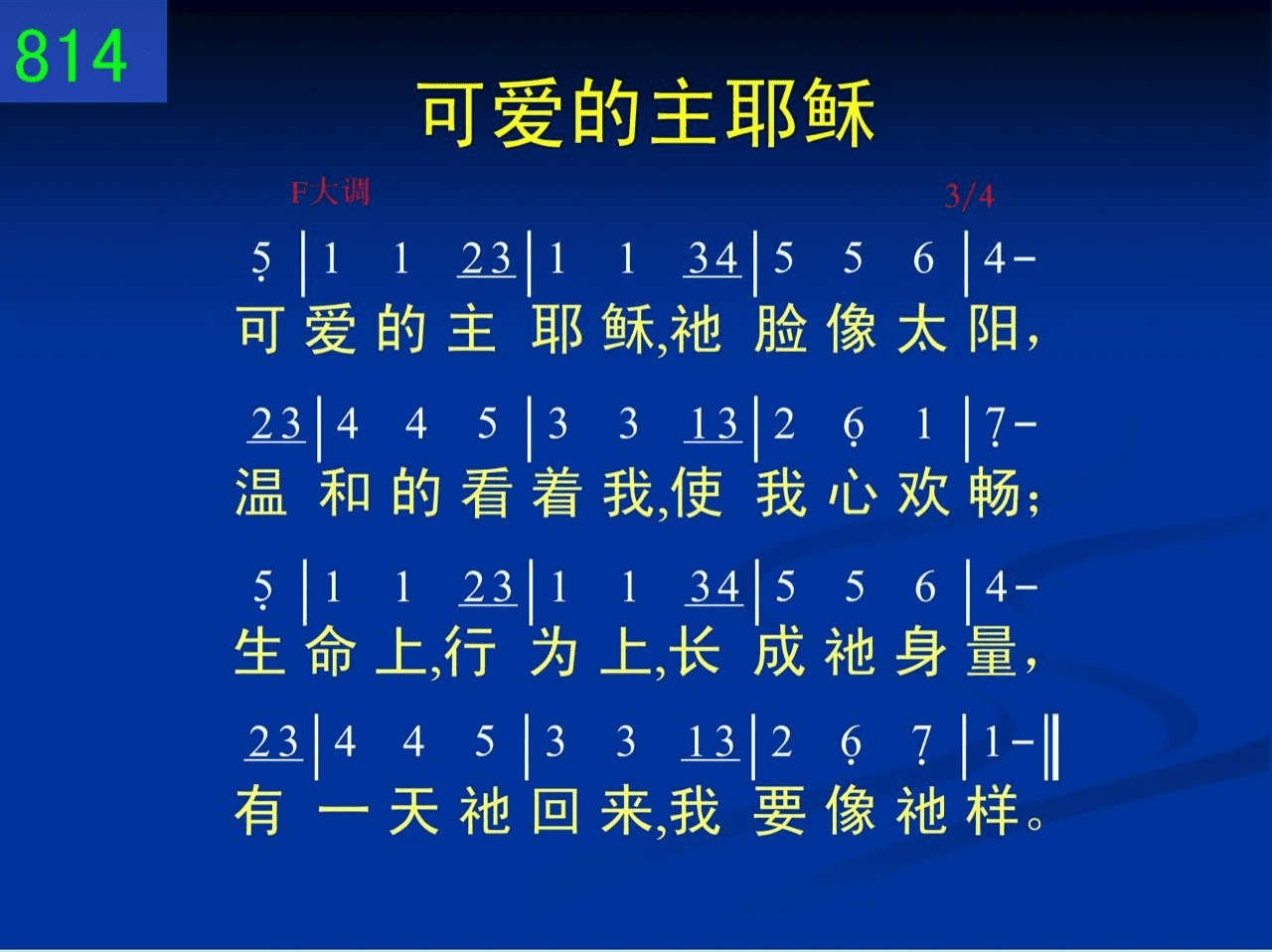 可爱的主耶稣,祂脸像太阳,温和的看着我,使我心欢畅;生命上,行为上,长成祂身量,有一天祂回来,我要像祂样。